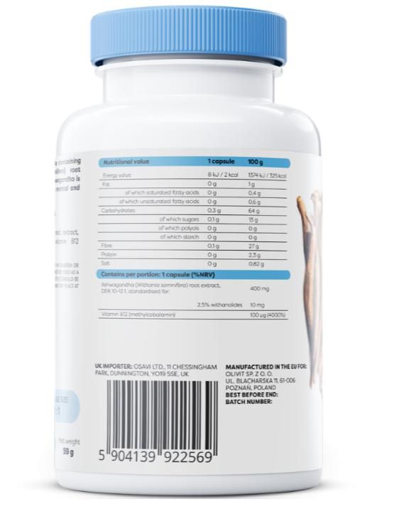 | Contents | Ashwagandha ( Withania somnifera ) root extract, peel (hydroxypropylmethylcellulose), inulin, vitamin B12 (methylcobalamin). |