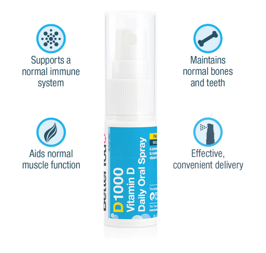 Delivering 1000IU per spray, D1000 provides an effective maintenance dosage for adults and teenagers.Formulated to provide optimal nutritional delivery, each spray provides the vitamin D in micro-sized droplets that coat and permeate the soft-tissue of the inner cheek, delivery the essential nutrients into the rich vein system below. This allows the formulation to quickly enter the bloodstream for optimal absorption. Vitamin D helps support healthy bones and teeth by aiding calcium absorption, contributes to immunity by contributing the healthy functioning of the immune system and helps maintain normal muscle function. Due to our changing diets and ever-increasing internal lifestyles, everyone should look to ensure they maintain healthy vitamin D levels throughout the year. However, the Department of Health outlines the following groups as “at-risk” and should strongly consider supplementation: