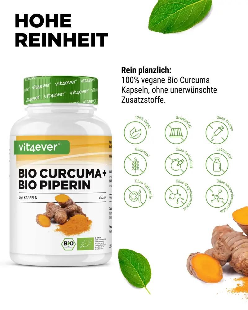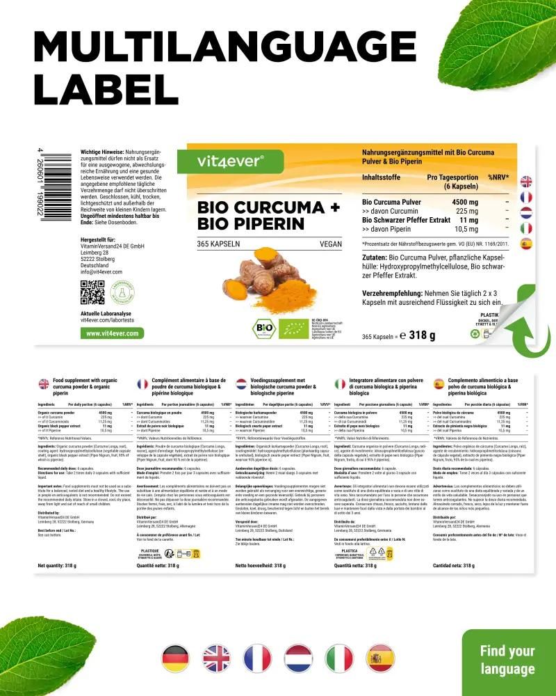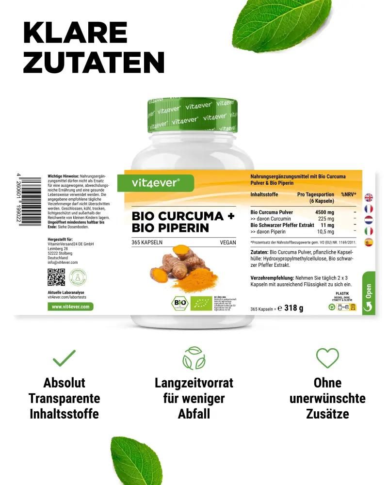Vit4ever Bio Curcuma + Bio Piperin, 365 vegane Kapseln