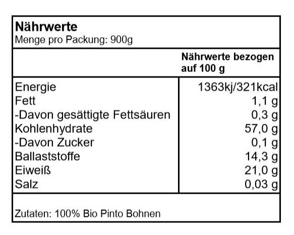 | Content | BIO Pinto Bohnen 900G |