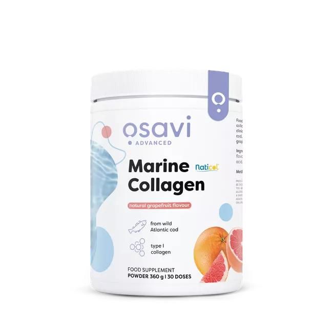 Would you like to improve the condition of your skin, restore its radiance and elasticity and reduce wrinkles? Or do you want to support your musculoskeletal system in your daily activities? In both cases, collagen can help. Try our Marine Collagen, consisting of Naticol ® patented bioactive collagen peptides, enriched with vitamin C, available in a choice of two flavours - grapefruit and lemon - and feel the difference.. Collagen is mainly a building protein; however, depending on the type of collagen, it has different functions, structure and location. Type I collagen is characterised by its high biocompatibility in human tissue. It is one of the most common types of protein, accounting for as much as 90% of the human body. It is found in skin, bones, tendons subcutaneous tissue, and many more.. There are many sources of type I collagen, including bovine, porcine and marine collagen, among which marine collagen contains the highest amount [1, 2]. Marine collagen has a high bioavailability and is an important alternative to collagen from other sources (e.g. for people who exclude bovine or pork products from their diet) [2, 3] An adequate amount of the so-called youth protein in the body supports many of its processes. Naticol® is a bioactive collagen peptide, the effect of which is supported by numerous clinical studies: among other things, it helps to improve skin elasticity and reduce wrinkles. Studies have shown that it has anti-ageing potential by improving skin firmness and elasticity and significantly reducing the number of wrinkles. It has also been noted to increase skin thickness and hydration and improve skin tone, radiance and brightness [4]. The results of the study indicate that taking marine collagen peptides also has benefits for joint function. Among other things, pain relief and improved mobility in the knee joints have been observed. Because collagen peptides accumulate in connective tissue, they are considered a valuable support for maintaining physical fitness throughout the ageing process [5]. The potential of Naticol® in improving muscle function in older people with symptoms of age-related muscle mass loss is also indicated. Taking Naticol® has been shown to increase lean body mass and enhance physical performance [6]. Interestingly, collagen may show potential in improving gut health and in supporting metabolic disorders. In in-vivo studies, it has been observed that it may contribute to both the prevention of inflammatory symptoms in the gut and the reversal of conditions that have already developed [7]. Naticol® may also influence body weight composition (reduced weight gain and reduced fat mass) and improved insulin sensitivity. Studies have shown that it contributes to weight control by maintaining normal blood glucose levels and lowering cholesterol levels [8] Our supplement contains bioactive collagen peptides from Naticol®, a carefully formulated and clinically tested type I collagen extracted from wild Atlantic cod. The Marine Collagen is in powder form, contains no unnecessary additives (it has a so-called clean label) and has excellent solubility. It has been enriched with vitamin C, which further supports collagen production. It is available in two flavours: with natural lemon flavour or with grapefruit flavour. The product is enriched with a natural sweetener derived from stevia. Thanks to the measuring cup inside, you can easily measure your daily serving (12 g), which contains 10 000 mg of Naticol® bioactive collagen peptides and 250 mg of vitamin C. The entire pack (360 g) is sufficient for one month of supplementation. |