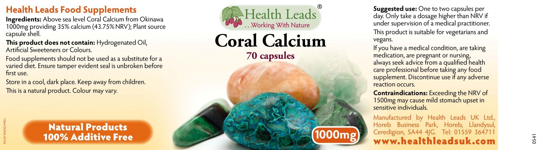 | Description | Health Leads Coral calcium The body actually digests fine coral calcium powder, making virtually all of the minerals available. A small sea creature creates coral by ingesting the ocean minerals and secreting them into a coral formation. What makes coral minerals so assimilable is their propensity to become ionic upon contact with moisture. This natural ability makes coral one of the most beneficial forms of minerals ● Calcium is used to maintain normal bones and teeth ● Contributes to signal transmission between nerve cells and normal muscle function ● Contributes to a normal function of digestiveenzymes and energy metabolism ● Takes part in cell division ● Necessary for normal muscle function |