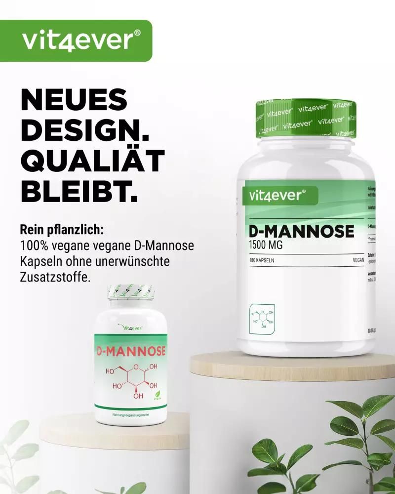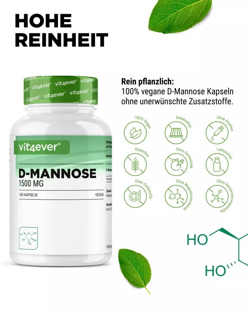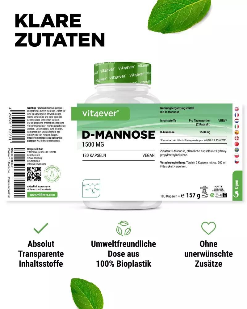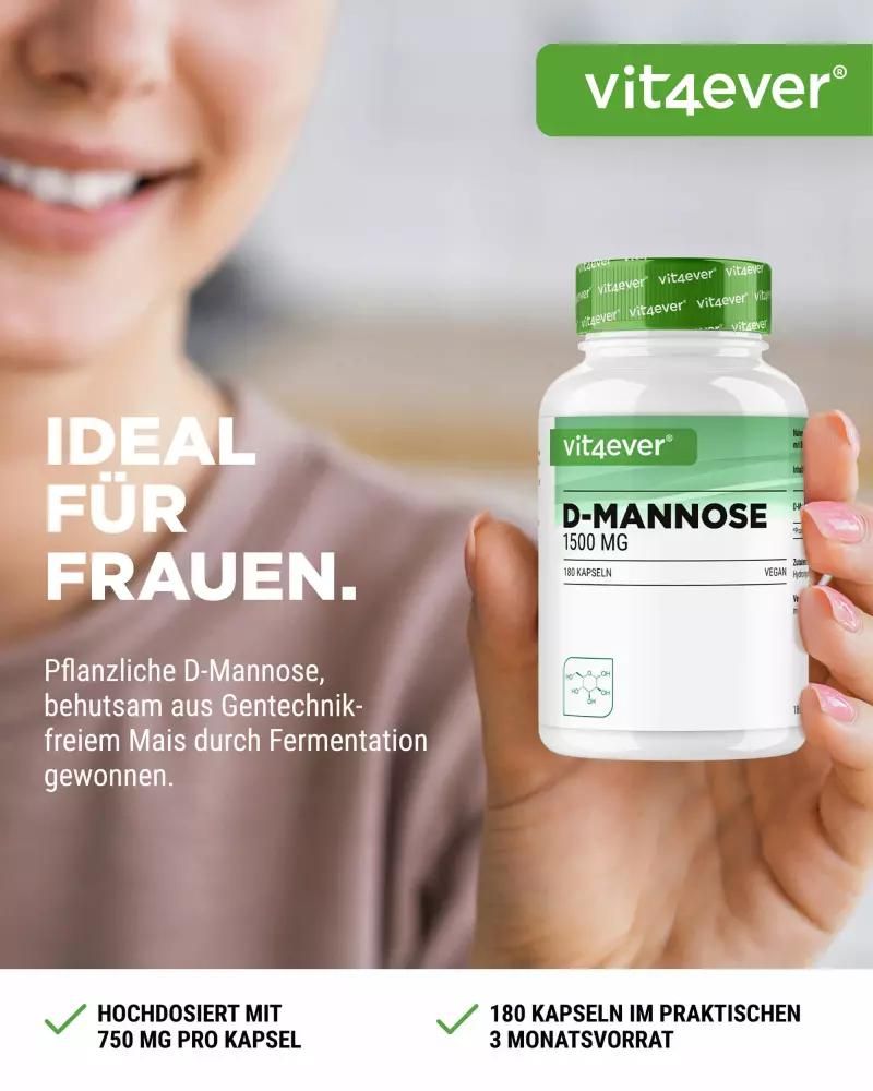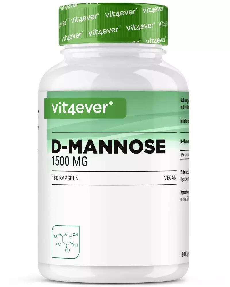 | Description | D-Mannose capsules: Natural simple sugar for your healthD-mannose, a naturally occurring monosaccharide, is more than just a simple sugar. This white, sweet-tasting powder is closely related to glucose and is found in fruits such as peaches, apples and blueberries. Although our bodies only produce small amounts, D-mannose has the potential to recognize and bind to bacteria such as E. coli, making it a valuable ingredient in nutritional supplements. High-dose D-Mannose capsules from Vit4everWith 1500 mg of D-Mannose per daily dose, Vit4ever D-Mannose capsules offer a powerful formula for daily needs. Each jar contains 180 capsules made from non-GMO corn, which guarantees a 3-month supply when taken 2 capsules daily. Benefits of Vit4ever D-Mannose capsules