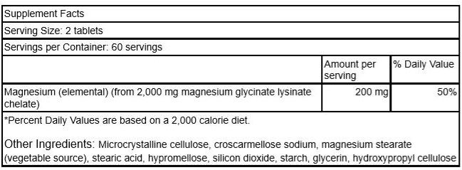 | Magnesium (from 2,000 mg magnesium lysinate glycinate chelate) | 200 mg | 48% |