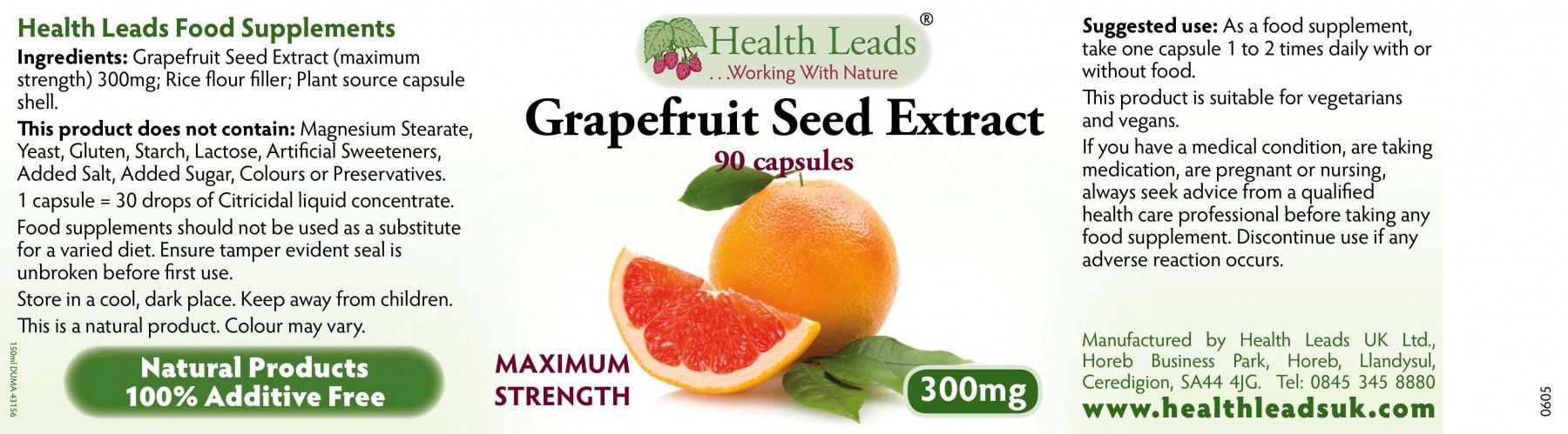 What is grapefruit seed extract? Grapefruit Seed Extract comes from the seeds, pulp, and white membranes of the grapefruit. Also referred to as Citricidal, GSE, or Citrus Seed Extract, Health Leads Maximum Strength Capsule contains high levels of disease-fighting antioxidants and bioflavonoids that stimulate the immune system. What does grapefruit seed extract do? Health Leads Grapefruit Seed Extract Health Leads Grapefruit Seed Extract is a high-quality dietary supplement containing extract from the seeds and pulp of grape fruits. Each capsule contains the same amount of grape seed extract as 30 drops of lemon cide concentrate. 400 mg Grapefruit Seed Extract (provides 98% bioflavonoids) (maximum strength). |