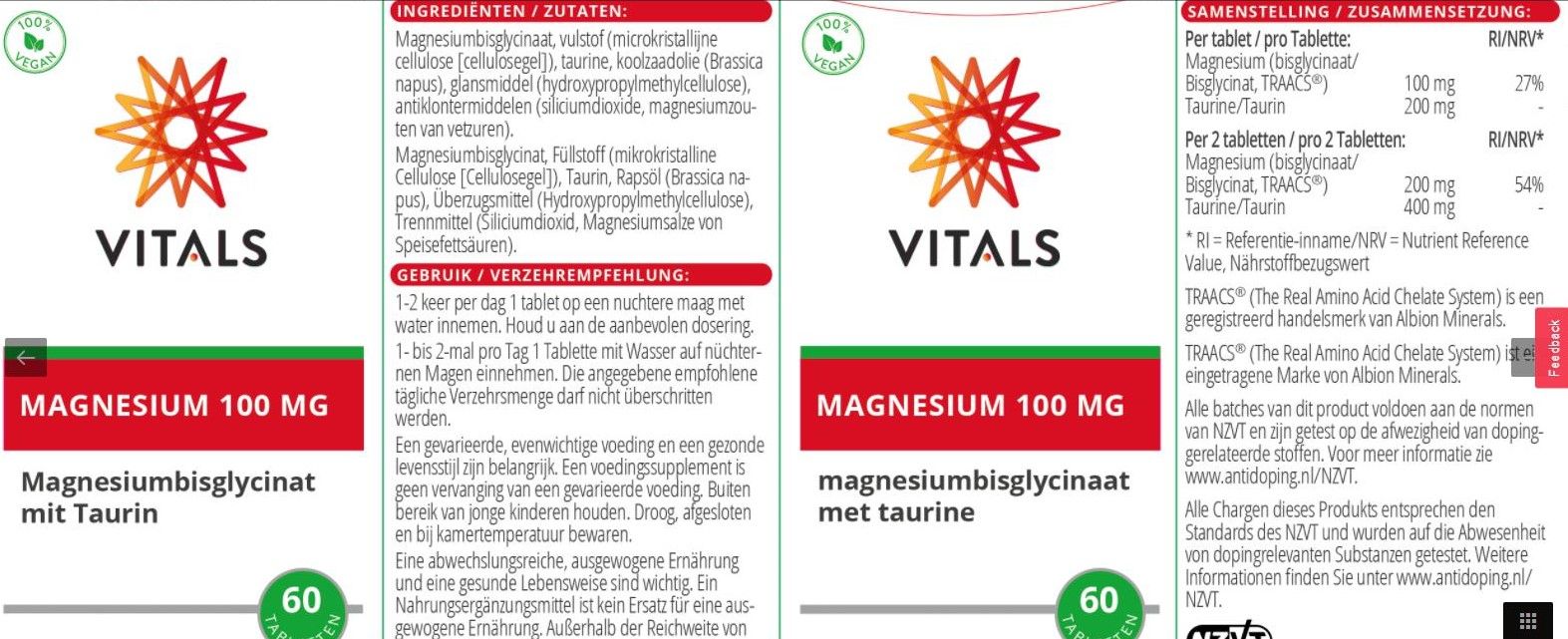 | Content | Magnesiumbisglycinat; Füllstoff: Cellulosepulver; Taurin; Bindemittel: Baumwollsamenöl; Trennmittel: Siliciumdioxid, Magnesiumstearat; Glanzmittel: Hydroxypropylmethylcellulose. |