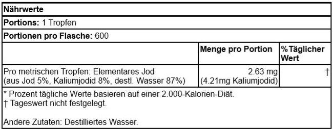 | Usage | This product must be diluted before use. Dilute 1 drop of this product in 60 drops (3 ml) of water and take 2 drops of this dilution containing 210 mcg iodine (140% NRV) once daily. This product is suitable for vegans and vegetarians. Discontinue use if any side effect occurs. Do not exceed the recommended daily dose. Not for daily continuous use. Do not use if you are allergic to iodine. |