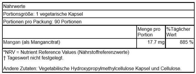 † Nutrient Reference Value (NRV*) not established Other Ingredients: Manganese Citrate, Cellulose, Hydroxypropyl Methylcellulose (capsule). |