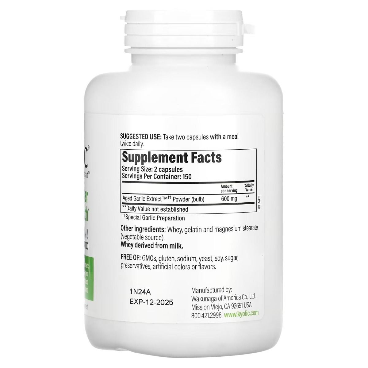 | Description | Formula 100 supports your cardiovascular system by maintaining circulatory function and overall heart health. Kyolic® Aged Garlic Extract™ (AGE) begins with organically grown garlic. The extract is then aged using a proprietary process that removes the odor-causing compounds of raw garlic and increases the bioavailable beneficial compounds. |