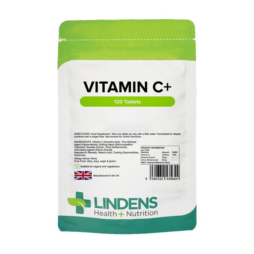 Lindens Vitamin C+ delivers 1250% NRV (Nutrient Reference Value) of vitamin C per tablet, specifically designed to maximize absorption. Lindens Vitamin C+ is formulated as a sustained release tablet, meaning the dose is administered over a longer period of time, allowing for maximum absorption. In addition, Lindens Vitamin C+ is enriched with bioflavonoids from citrus fruits and rosehip extract.