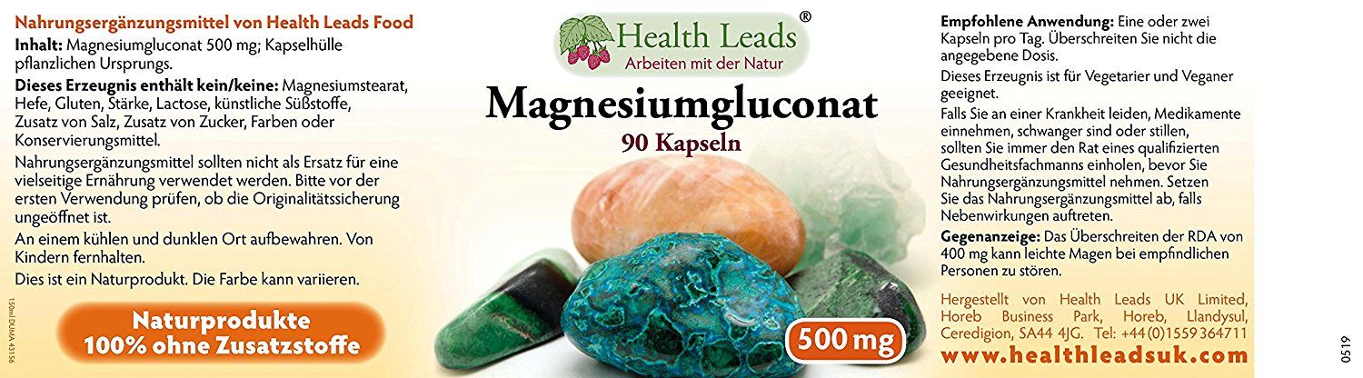 | Description | HealthLeads pure magnesium gluconate supplement contains 27 mg of elemental magnesium per 500mg vegetarian capsule. Magnesium Gluconate is important for the preservation of bones and teeth ● Takes part in the information transmission of the nervous system ● Contributes to a normal electrolyte balance and cell division ● Support for the energy metabolism, eg production of proteins ● Supports normal muscle function |