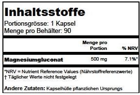 | Warning | At kidney problems only use magnesium gluconate under the supervision of a physician - Magnesium salts should generally not be administered to patients with kidneyproblems. If you have a medical condition, are taking medication, are pregnant or nursing, always seek advice from a qualified health care professional before taking any food supplement. |