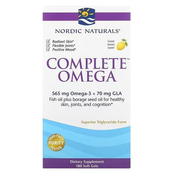 Fish oil plus borage seed oil for healthy skin, joints, and cognition. Complete Omega™ combines omega-3s EPA and DHA from fish oil with the unique omega-6 gamma-linolenic acid (GLA) from borage seed oil. This blend helps nourish skin, promotes a healthy mood, and supports cognitive function and joint health. Borage (Borago officinalis) is a bee-friendly flowering plant with beautiful star-shaped blooms-one of nature's richest sources of GLA. Every batch of Nordic Naturals fish oils is tested by a third- party certified lab for environmental toxins, including heavy metals. All fish oils are in the triglyceride form and surpass the strictest international standards for purity and freshness. Certificates of Analysis available upon request. Radiant Skin: Supports normal skin cell maintenance and repair. Joint Health: Promotes joint mobility and flexibility. Brain Health & Mood: Supports optimal brain function and a healthy mood. All Nordic Naturals fish oils are in triglyceride form for superior absorption. |