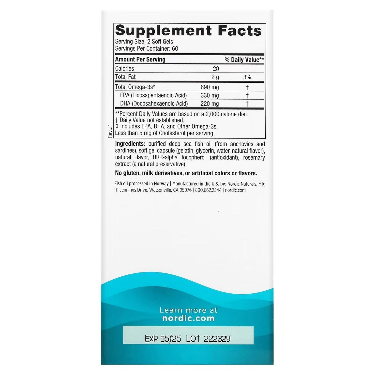 | Contents | Purified deep sea fish oil (from anchovies and sardines), soft gel capsule (gelatin, glycerin, water, natural lemon flavor), natural lemon flavor, d-alpha tocopherol (antioxidant), rosemary extract (a natural preservative). |