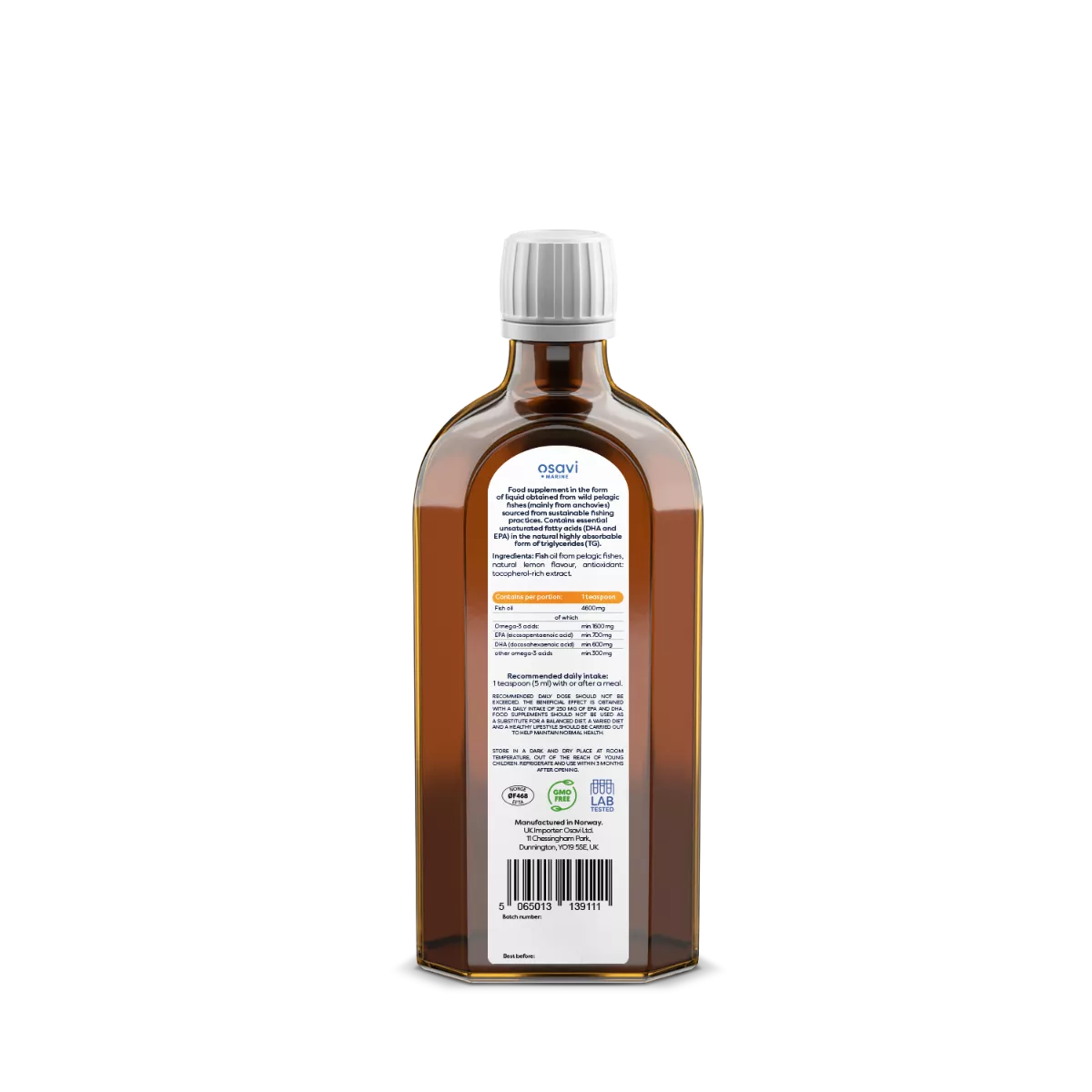 Fish oil from pelagic fishes, natural lemon flavour, antioxidant: tocopherol-rich extract.