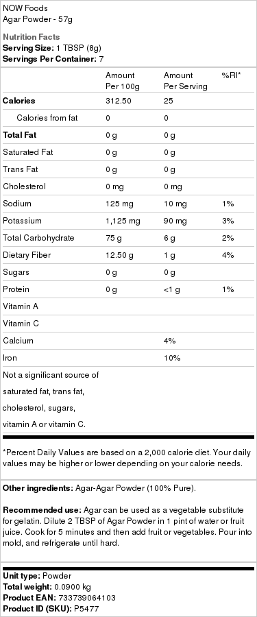 | Contents | NOW Foods Agar Powder 57 grams |