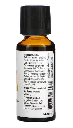 Aroma: Pleasant, sweet spiciness. Properties: Warming & soothing. Extraction method: tangerine, orange - cold pressed; Cinnamon Bark, Cardamom, Nutmeg, Ginger, Clove - Steam Distilled NOW ® Essential Oils are analytically tested for identity, purity and adulteration to ensure the highest quality. |
