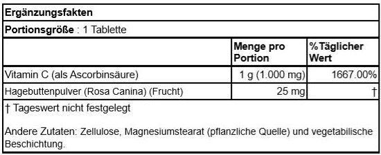 Description Vitamin C ist ein wasserlöslicher Nährstoff, der für seine essentielle Wirkung auf das Immunsystem bekannt ist. Vitamin C ist darüber hinaus für die Produktion von Kollagen (einem Strukturprotein im Bindegewebe) bedeutsam und daher wichtig für Haut-, Knochen- und Gelenkgesundheit. Vitamin C wird auch im Aminosäurestoffwechsel, für die Neurotransmitter-Synthese und die Verwertung zahlreicher Nährstoffe wie Folsäure und Eisen benötigt. Vitamin C ist eine wichtige und sehr wirksame Antioxidantie, und hilft damit dabei die Zellen und Moleküle des Körpers vor Schäden durch freie Radikale und oxidative Moleküle zu schützen, die dürch Stoffwechselreaktionen und Umweltbelastungen entstanden sind. Dieses Produkt wurde speziell entwickelt, um Vitamin C in regelmäßigen Mengen an den Körper freizugeben und enthält Hagebuttenöl als zusätzliche und natürliche Vitamin C-Quelle.