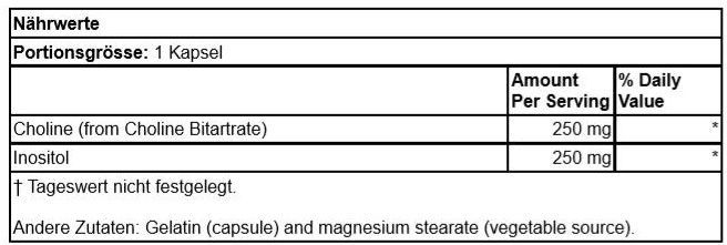 | Description | Cholin & InositOL sind Mitglieder der Vitamin-B-Familie. Cholin ist für normale synpatische Übertragungen, Hirngesundheit und den Stoffwechsel von Fettsäuren in der Leber nötig. InositOL ist ebenfalls für die Gesundheit des Hirns und des Nervensystems notwendig. Sowohl Cholin, als auch IsonotOL sind wichtige Komponenten von Zellmembranen. |