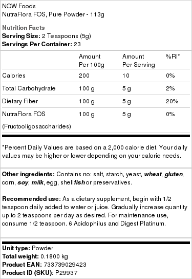 | Content | Now Foods NutraFlora FOS Pure Powder (113 g) |