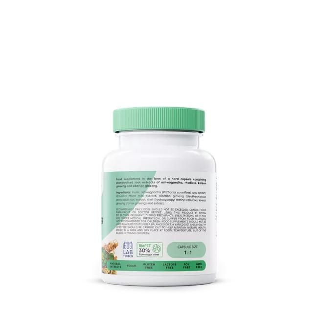 Description Dietary supplement in the form of a hard capsule containing standardized extracts of the roots of ashwagandha, Rhodiola rosea, ginseng and Siberian ginseng.
