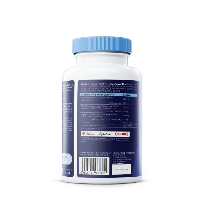 | Contents | Ekstrakt z owoców buzdyganka naziemnego (Tribulus terrestris), ekstrakt z korzenia ashwagandha (Withania somnifera), ekstrakt z kory sosny nadmorskiej(Pinus pinaster), otoczka (hydroksypropylometyloceluloza), OptiZinc® (siarczan mono-L-metioniny cynku, naturalny aromat waniliowy), L-selenometionina, inulina. |