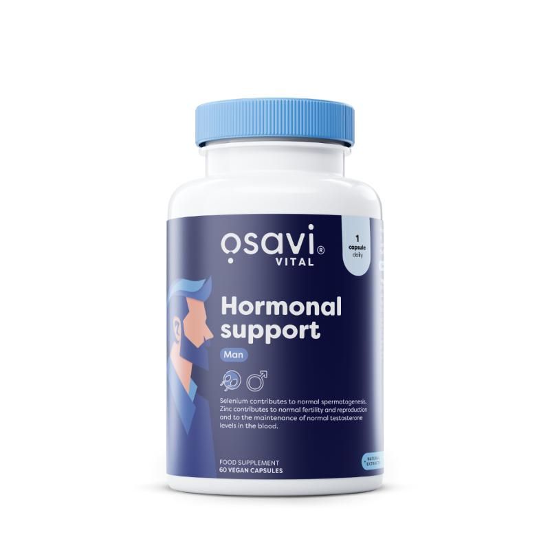 | Description | Wondering how to take care of your specific male health needs and improve your overall well-being? Choose supplementation that adequately supports the functions of your endocrine system. Specific minerals may be helpful in maintaining normal testosterone levels and reproductive function. The male body has specific needs, related to both maintaining normal hormone levels and protecting against oxidative stress that can be induced by harmful environmental factors. Our Hormonal Support Man food supplement combines ingredients that support male health in these important areas. The zinc in the product helps to support normal fertility, normal reproductive function and normal blood testosterone levels, while selenium contributes to normal spermatogenesis. In addition, selenium and zinc help to protect cells from oxidative stress. Hormonal Support Man from Osavi is a unique blend of plant extracts enriched with added selenium and zinc. In the product, you will find mace fruit extract (Tribulus terrestris) standardised to 90% saponins, ashwagandha root extract KSM-66® with the most extensive set of scientific studies and clinical trials standardised to 5% vitanolides and maritime pine bark extract (Pinus pinaster) standardised to min. 67% oligomeric proanthocyanidins (OPCs). Hormonal Support Man also contains selenium, Selenium SeLECT®, and zinc OptiZinc®. The recommended daily serving is 1 capsule, which is best taken after a meal. The product is available in three versions, which - depending on your needs - will last you for one month (30 capsules), two (60 capsules) or three months of supplementation (90 capsules). |