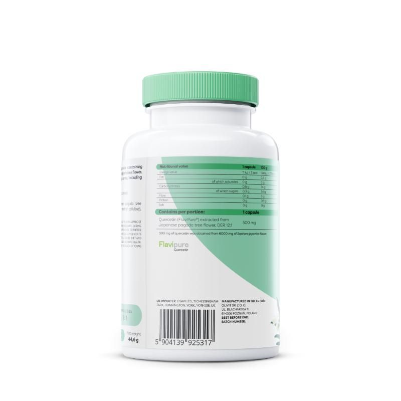 | Description | If you are looking for a natural supplement to support your body, whether you have an unhealthy diet, lead a busy lifestyle or have been exposed to a range of harmful external factors, try Natural Quercetin 500 mg by Osavi. Quercetin is a flavonoid that is found in plants, including some flowers, fruits and vegetables. Flavonoids are chemical compounds from the polyphenol group that exhibit a number of beneficial properties for the human body. An excellent source of quercetin is the Japanese pearl plant - its flowers and fruits resembling strings of pearls have been used in Asian culture for centuries. Osavi Natural Quercetin 500 mg is a food supplement containing high-quality FlaviPure® quercetin, extracted from Japanese pearl flowers (Sophora japonica) - DER 12:1. The amount of quercetin contained in 1 capsule (i.e. 500 mg) was obtained from as much as 6,000 mg of Japanese pearl flowers. The product is suitable for vegetarians and vegans. Natural Quercetin 500 mg is a food supplement free of unnecessary additives. It does not contain gluten, lactose, soya or GMOs. The product, in hard capsule form, is available in packs containing 60 or 120 capsules. The recommended daily serving is 1 capsule per day, taken after a meal. |