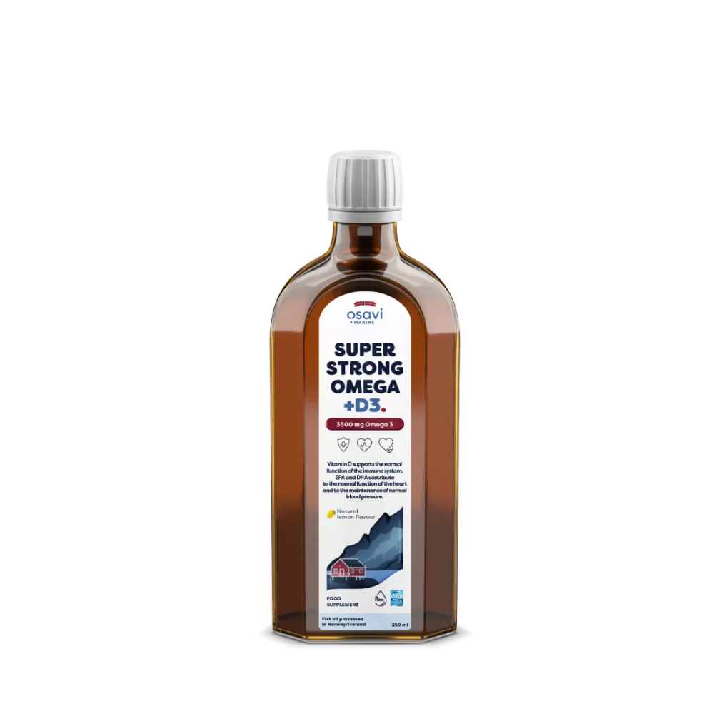 If you want to maintain optimal brain, heart, vision and normal immune function, pay attention to your daily intake of omega-3 fatty acids and vitamin D3 from your diet. Find your source in our Super Strong Omega + D3 fish oil, 3500 mg Omega-3, which is rich in these valuable health ingredients. Omega-3 fatty acids are key to maintaining normal heart function, blood pressure, proper triglyceride levels and brain and vision function. Vitamin D3 is involved in the proper functioning of the immune system and contributes to the maintenance of healthy bones and teeth. Fish oil is a rich source of omega-3 unsaturated fatty acids, which include eicosapentaenoic acid (EPA) and docosahexaenoic acid (DHA), and contains an essential component for maintaining normal immunity - vitamin D3. Omega-3 fatty acids are incorporated into the structure of phospholipid membranes, participate in cell signalling and influence the normal functioning of the nervous system. EPA and DHA acids contribute to normal heart function through their beneficial effects on triglyceride levels, blood pressure, platelet aggregation and endothelial function [1]. The proper function of the heart, along with other components of the circulatory system, is essential for every cell in the body to receive the oxygen necessary for life. DHA acids are part of the structure of the brain and thus contribute to the maintenance of normal brain functions such as learning, memory, for example. Taking part in mechanisms involved in counteracting damage to the organ of sight caused by oxidative stress, DHA acids influence correct, clear vision [2]. Together with EPA acids, they are involved in the production of mediators that are involved in the regulation of inflammatory processes [3]. Together with vitamin D3, omega-3 fatty acids support the proper function of the immune system, so that our body generates the correct response when a pathogen or the body's own cells are recognised [4]. Vitamin D3 during the cold season reduces the risk of infection [5]. Furthermore, it contributes to the maintenance of healthy bones and teeth by influencing tissue density and strength. Dietary sources of EPA and DHA include cod, salmon, mackerel, herring, sardines, oysters and fish oil. Vitamin D3 is partly produced in the skin when exposed to sunlight, and we can also obtain it from oily marine fish such as salmon, sardines, herring or egg yolks. However, in our climate, vitamin D3 supplementation is recommended throughout the year regardless of sun exposure during the summer months [6]. If you need to enrich your diet with a high concentration of EPA and DHA acids, reach for our food supplement Super Strong Omega + D3, 3500 mg Omega-3 made in Norway. Super Strong Omega + D3, 3500 mg Omega-3 is an oil extracted from sustainably fished pelagic fish (mainly anchovies). It contains a high concentration of essential fatty acids (EPA and DHA) in a highly digestible triglyceride (TG) form and vitamin D in the form of cholecalciferol. One teaspoon per day (5 ml) provides 4600 mg of fish oil, of which up to 3500 mg are omega-3 fatty acids (including: 1840 mg EPA and 1420 mg DHA) and 50 μg = 2000 IU (1000%) of vitamin D3. The product has a natural lemon flavour and is free of preservatives, colours and GMOs. Take care of your heart, brain, eyesight and proper immunity with our Super Strong Omega + D3, 3500 mg Omega-3! |