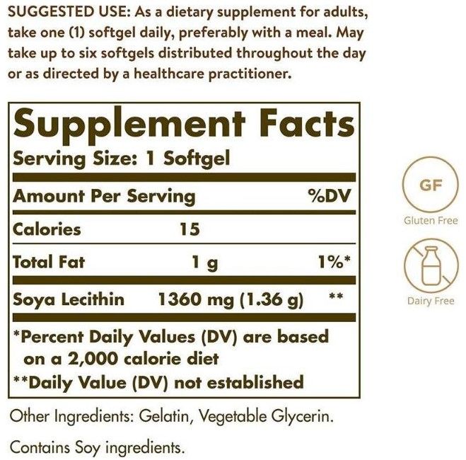 | Description | Solgar's Lecithin softgels contain phosphatidylcholine, which plays an important role in our brain and nervous system. Lecithin also contains naturally occurring essential fatty acids and inositol. Lecithin helps emulsify fats and enables them to be dispersed in water. |