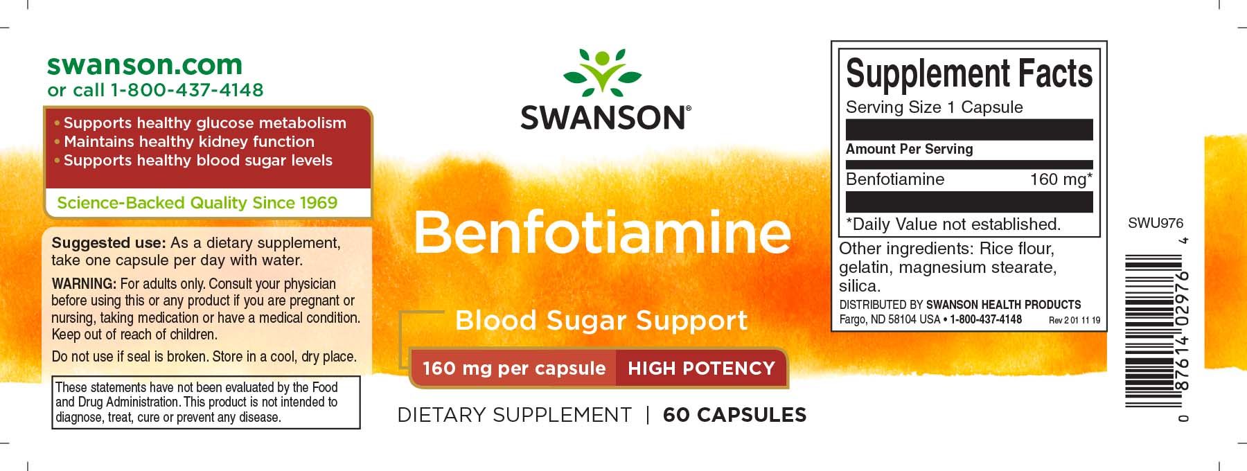 Benfotiamine is a fat-soluble form of thiamin, or vitamin B-1. It has special active properties that make it beneficial for supporting glucose metabolism and protecting tissues susceptible to advanced glycation end-products (AGEs). Plus, it still delivers all the conventional benefits of regular thiamin. Swanson Ultra Benfotiamine is a great natural supplement for anyone concerned with glucose health, kidney health and ocular health |