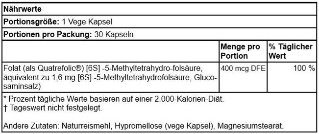 SWANSON FOLATE 5-METHYLTETRAHYDROFOLIC ACID (QUATREFOLIC) 400MCG 30 CAPS