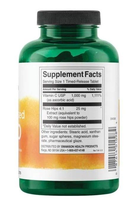 | Description | Try Swanson Vitamin C with Rose Hips for all-day release of vitamin C! This timed-release formula gradually delivers 1,000 mg of vitamin C and 100 mg of rose hips over a 6-8 hour period to promote maximum absorption. Rose hips contain bioflavonoids that promote the absorption of the vitamin and enhance its antioxidant effects. Vitamin C is best known for supporting healthy immune system function and is also needed for iron absorption and the body's collagen production. Its antioxidant properties promote eye, heart and metabolic health. |