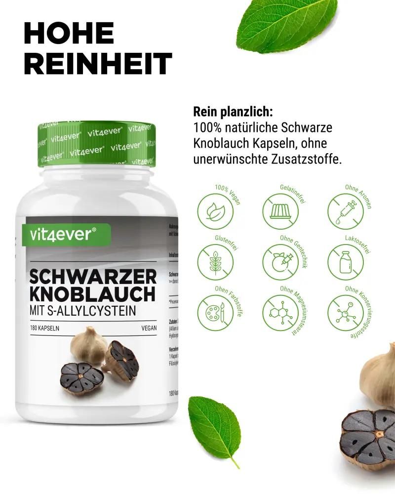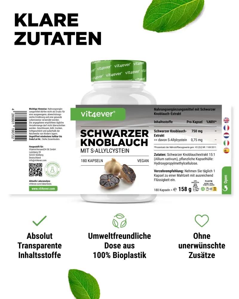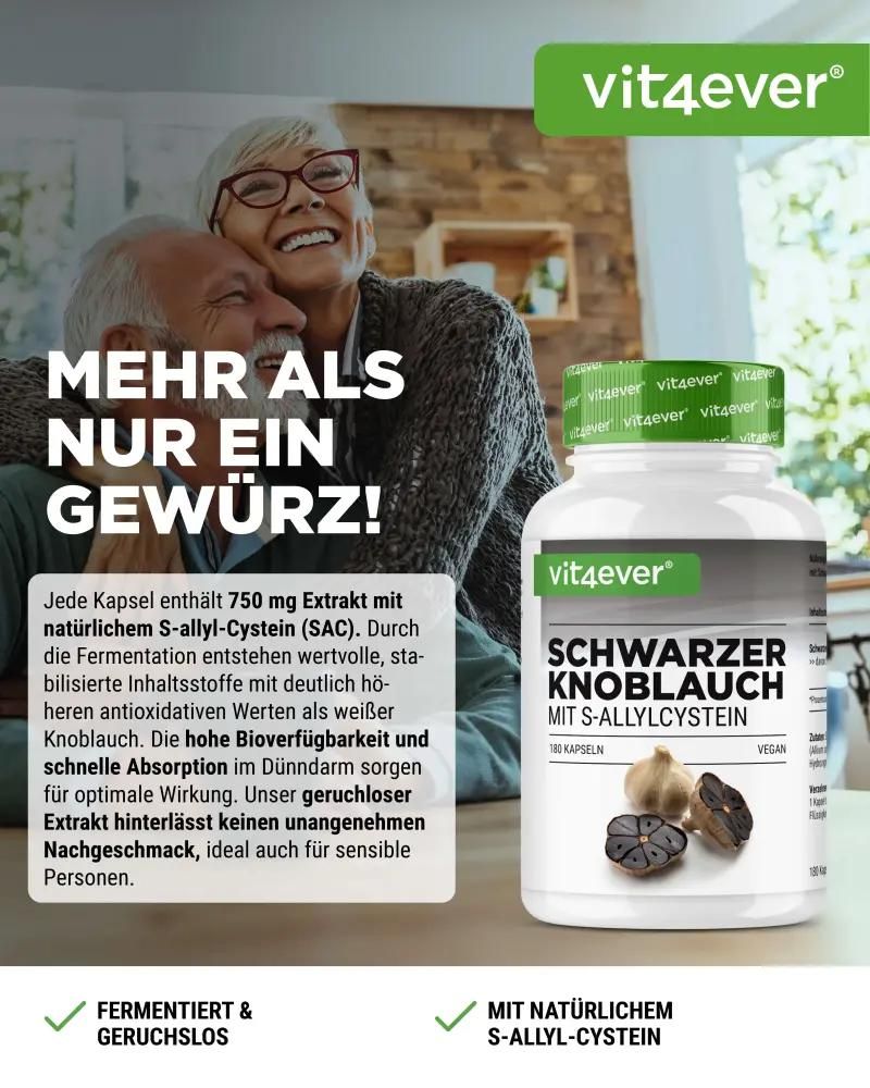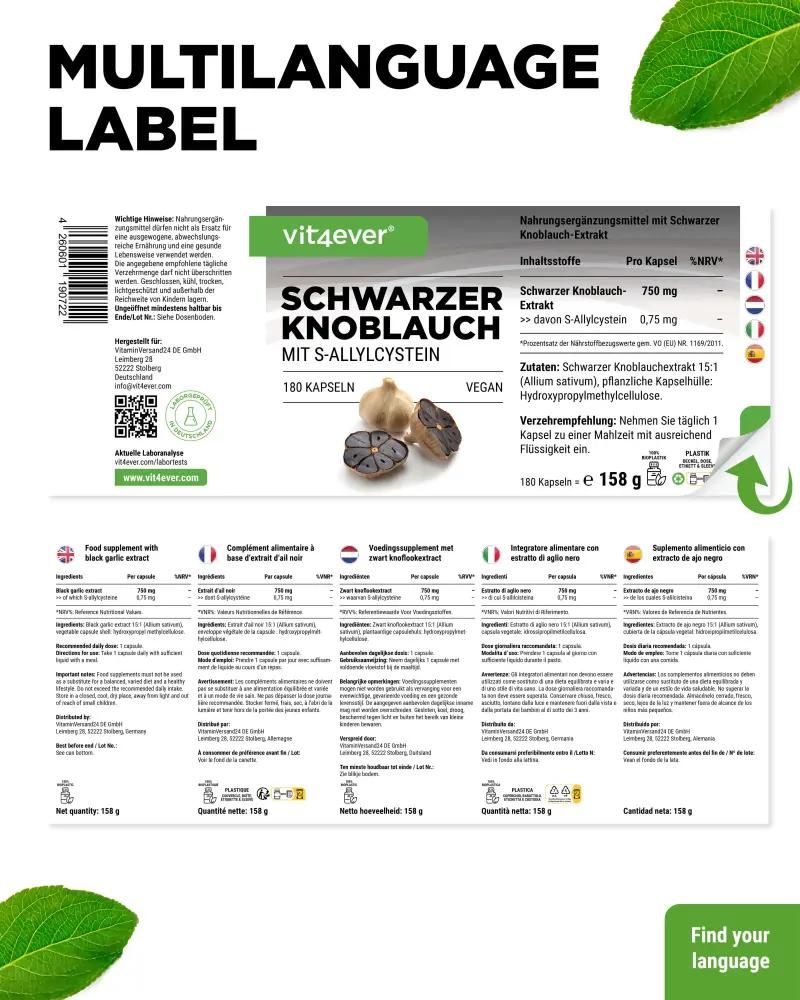 • 180 high-dose garlic capsules with 750 mg black garlic extract (Allium sativum).