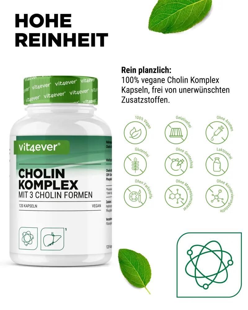 Vit4ever Choline Complex – triple strength for your supplyMore than just choline – your daily support with a systemImagine you want to give your body exactly what it needs for key metabolic processes – targeted, efficient, and uncomplicated. The Vit4ever Choline Complex provides you with three high-quality choline sources in one capsule – for a well-thought-out nutritional supplement without compromise. Why Choline is so importantCholine is a vitamin-like micronutrient and plays a central role in fat metabolism. It is a component of cell membranes, is required for signal transmission, and, according to the health claim, contributes to the maintenance of normal liver function.¹ What's particularly interesting is that since the body can only produce a limited amount of choline itself, targeted supplementation is worthwhile. 3 forms of choline – cleverly combinedEach capsule contains: