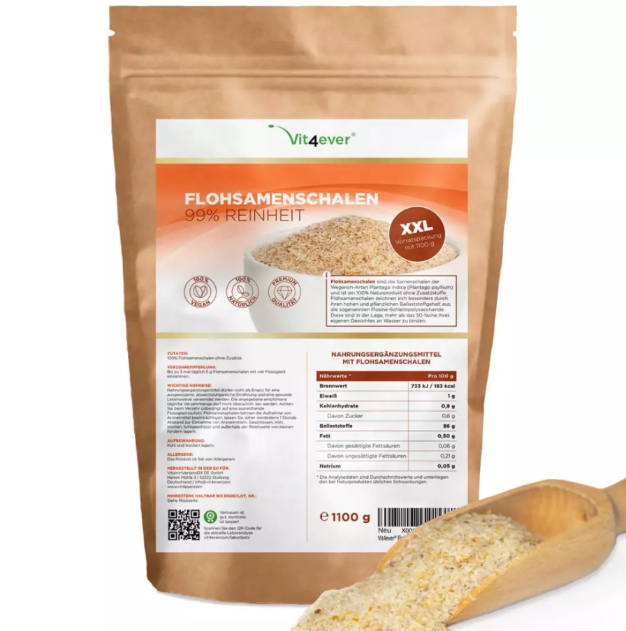 - 1100 g / 1.1 kg pure psyllium husks in the best raw food quality. Our psyllium seeds are particularly rich in fiber (86 g per 100 g).