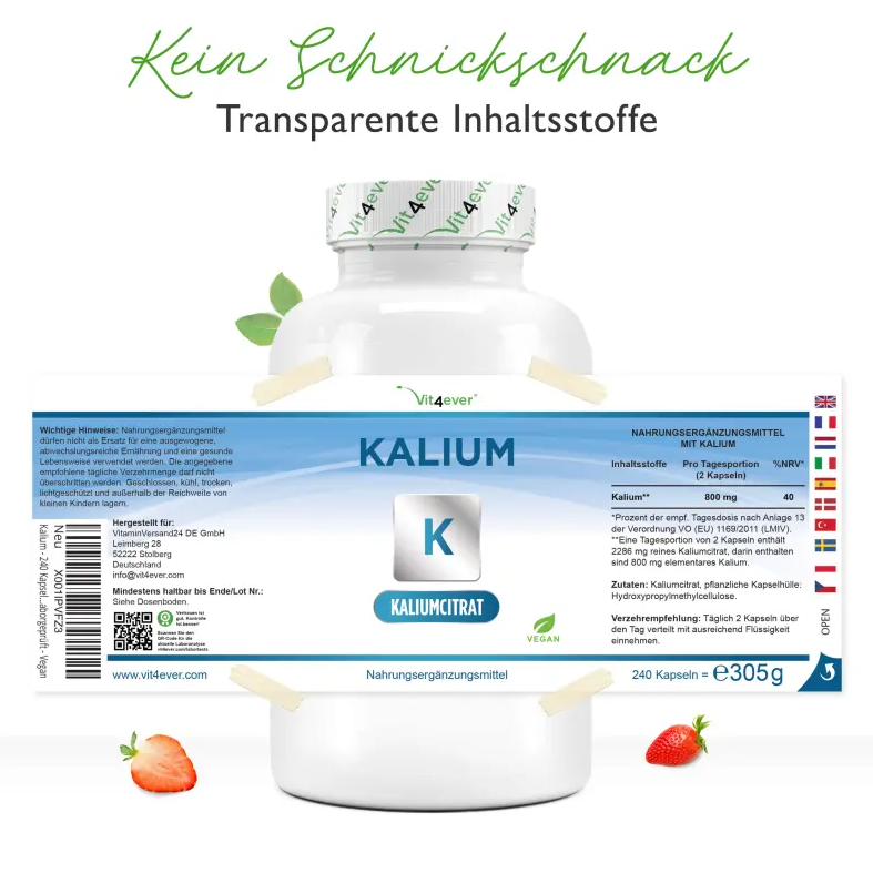 Why potassium citrate?This potassium compound is a combination of potassium and citric acid salt. Its advantage over other compounds is that it is slightly alkaline (pH: 7.5-9) and is better metabolized in the citric acid cycle, as this is an endogenous cycle/process. This allows the potassium to be better digested without damaging stomach acids or the intestines, and it has a higher bioavailability. Furthermore, our potassium citrate comes from plant-based fermentation of GMO-free corn and has a high elemental potassium content of 35%. Vit4ever potassium citrate capsules in detail:Each container contains 240 high-dose capsules with an elemental potassium content of 800 mg per daily serving (2 capsules), sufficient for a full four months. Furthermore, our capsules are 100% vegan and free from animal ingredients, as well as additives and separating agents of any kind, making them safe for vegans and vegetarians to take. |