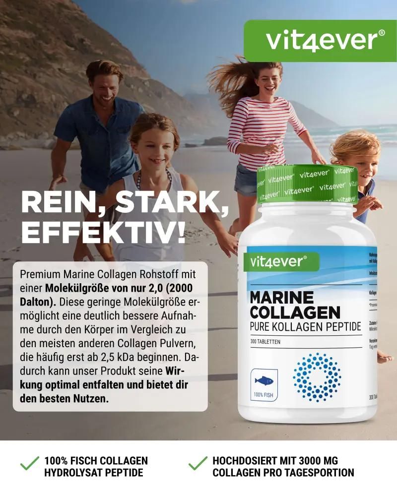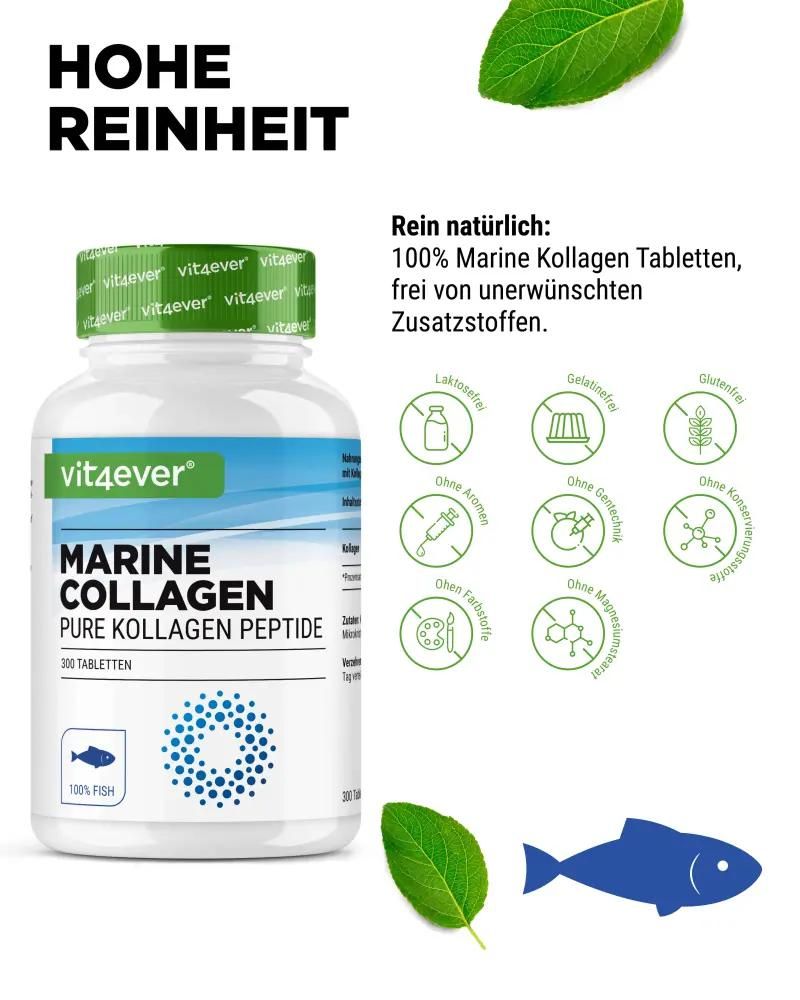 What makes Marine Collagen special?High-quality collagen peptides:The type I collagen used comes from fish and is characterized by its high purity and bioavailability. It is obtained through a gentle hydrolysis process that preserves its natural properties. Long-lasting care:With 300 tablets per container and a daily dose of 6 tablets, you are well supplied for 50 days. Perfect for regular use. Pure & natural:Vit4ever Marine Collagen is free from unnecessary additives such as colorants and preservatives as well as lactose and gluten – ideal for a conscious diet. Highlights at a glance