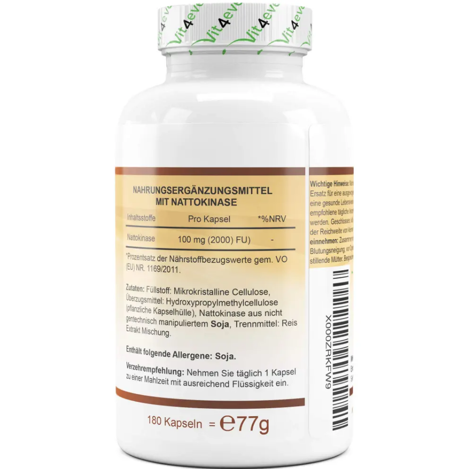 | Contents | Bulking agent: microcrystalline cellulose, coating agent: hydroxypropylmethylcellulose (vegetable capsule shell), nattokinase from non-genetically modified soy, anti-caking agent: rice extract mixture. |