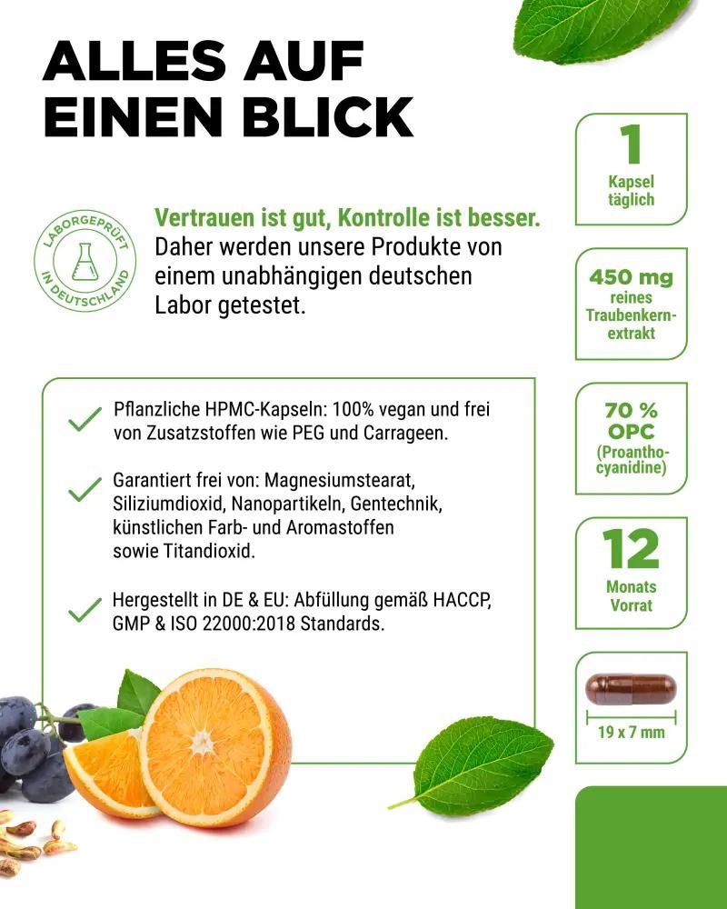 • High dosage: 450 mg grape seed extract per capsule, of which 315 mg OPC.