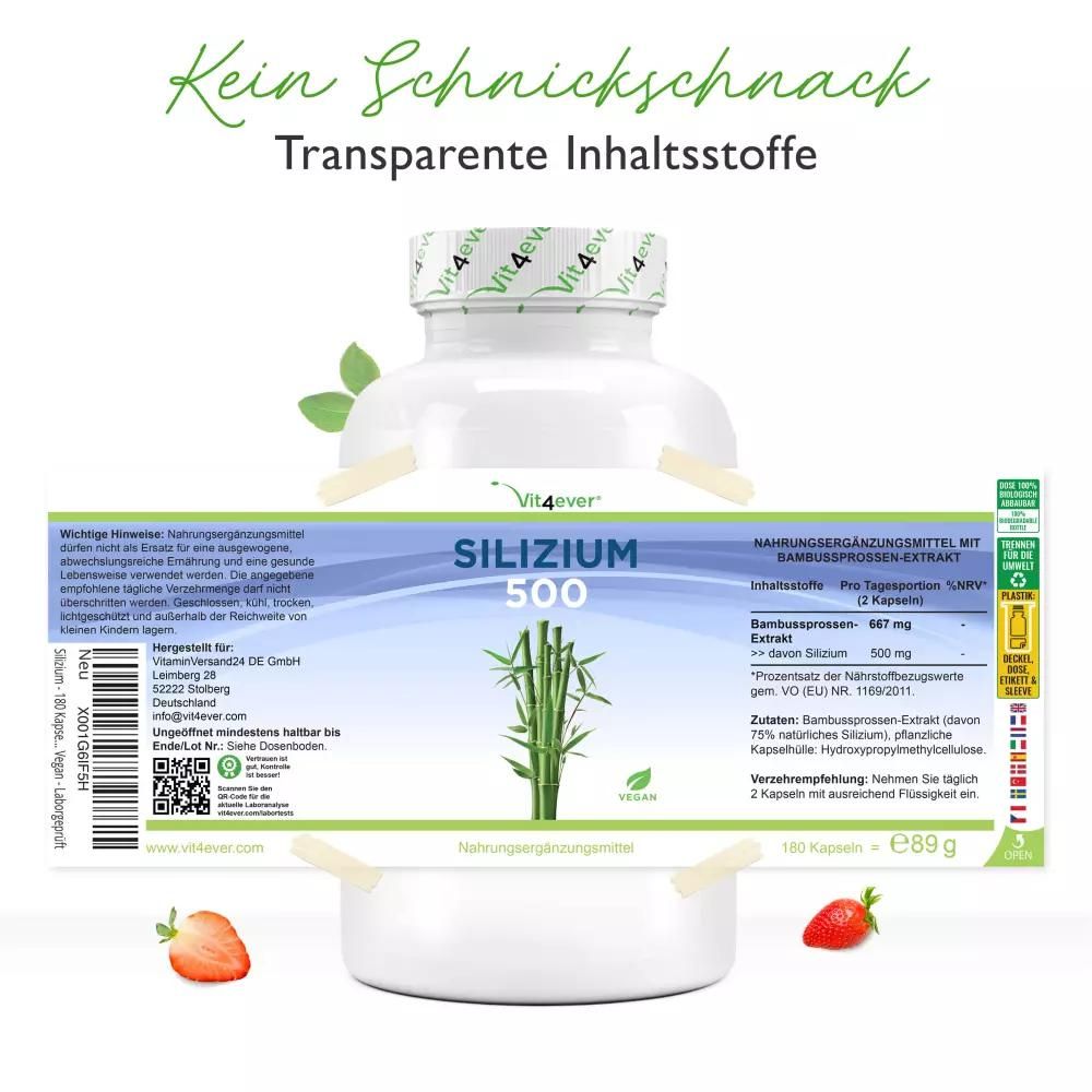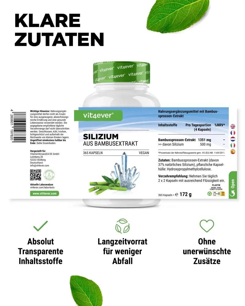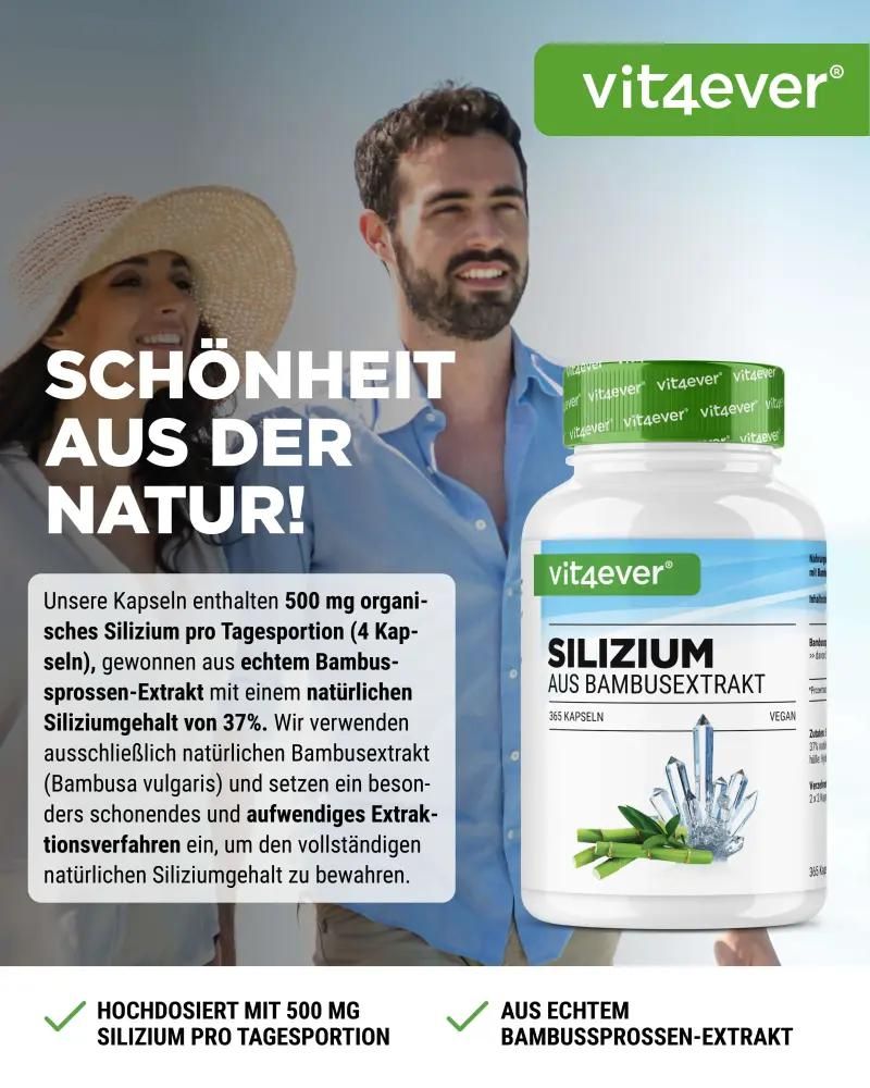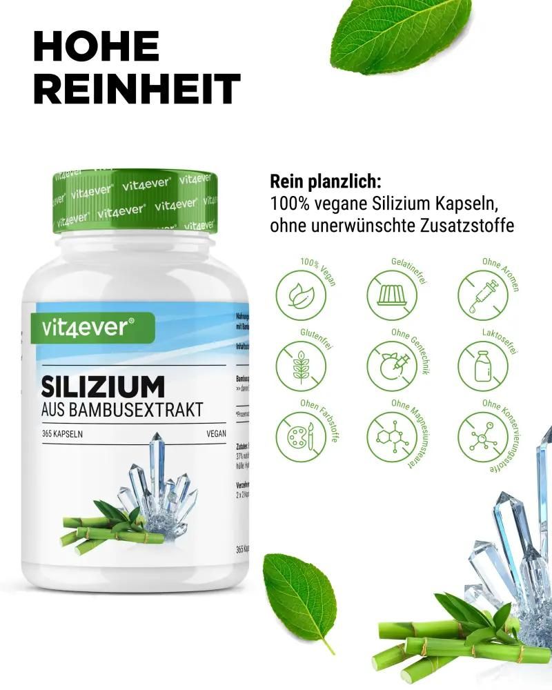Natural silicon from bamboo extractVit4ever Silicon provides you with high-quality organic silicon from bamboo shoots – one of the most plant-based and richest sources of this versatile mineral. With a 37% natural silicon content , each daily serving (4 capsules) contains a full 500 mg of pure silicon . It's ideal as a daily supplement for anyone seeking holistic support for their skin, hair, nails, and connective tissue. Plant-based, high-dose & without additivesSilicon is a trace element that occurs naturally in many plant-based foods—especially abundantly in bamboo shoots. The extract used in this product comes from a carefully processed bamboo extract with a high degree of standardization. The capsule shell is purely plant-based—free of gelatin, magnesium stearate, or artificial additives. Highlights of Vit4ever Silicon