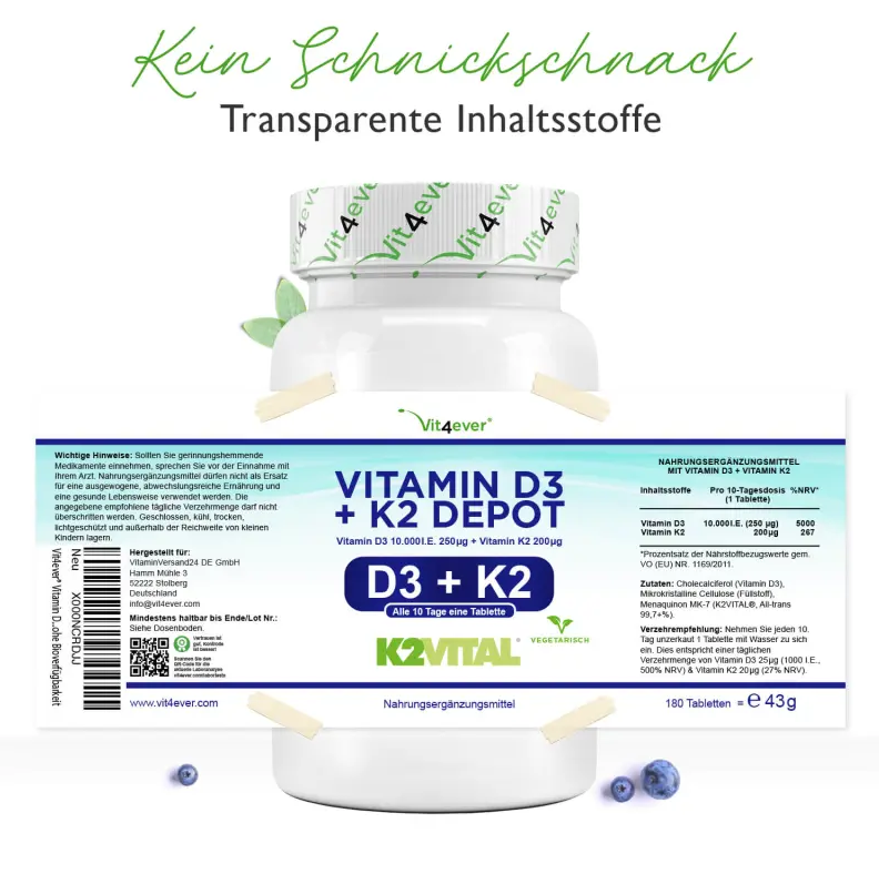Dosage: Each 6 mm small filler-reduced tablet contains 10,000 IU of vitamin D3 + 200 µg of vitamin K2 menaquinone 7 - MK7 with a guaranteed all-trans content of 100%. Without undesirable additives: The vitamin D3 + K2 tablets are 100% vegetarian and free from undesirable additives such as release agents, magnesium stearate, flavors, colors or preservatives. Of course, the tablets are also free of lactose, gelatine and gluten. |