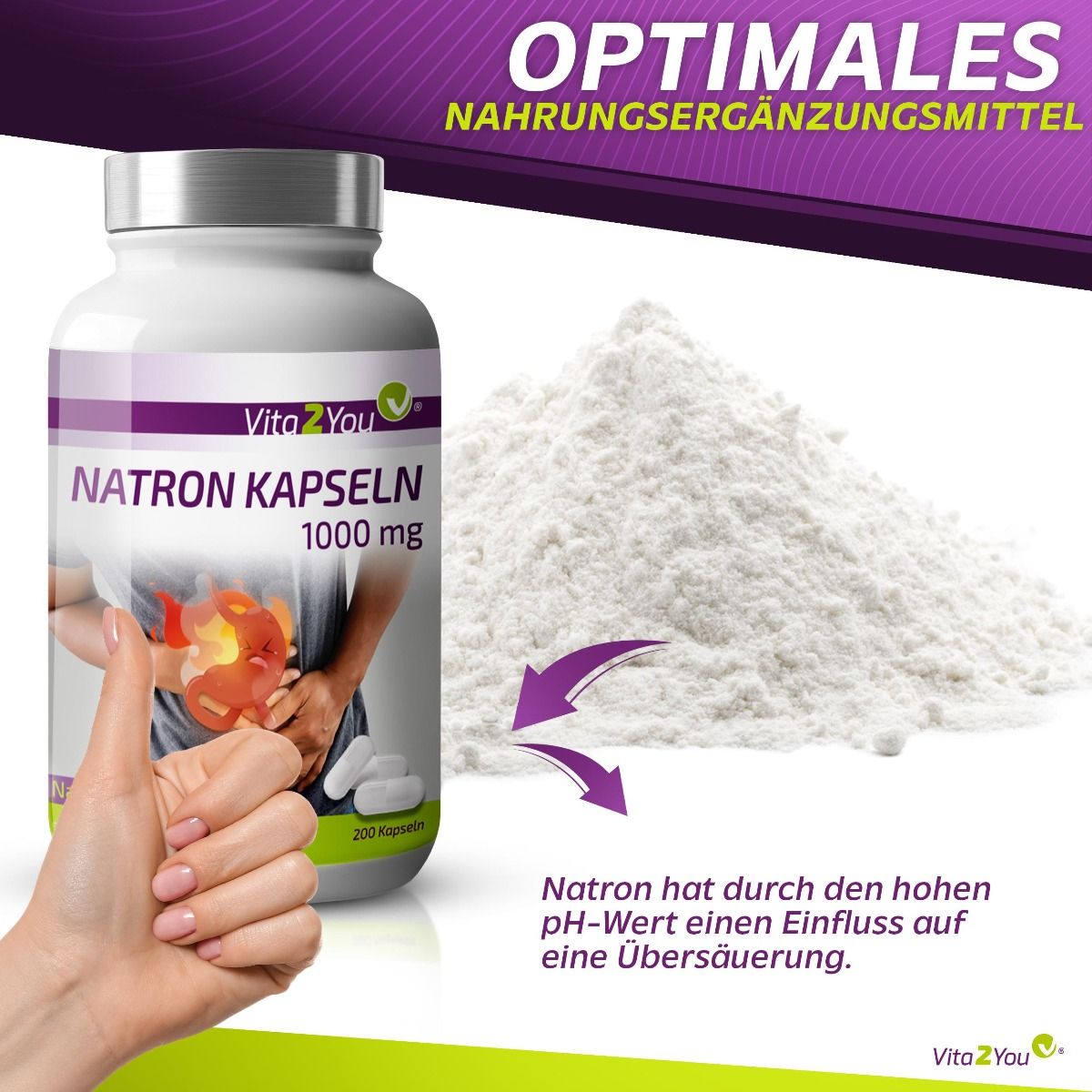 Vita2You Baking Soda Capsules 1000mg - 200 Capsules - Sodium Bicarbonate - Acidosis