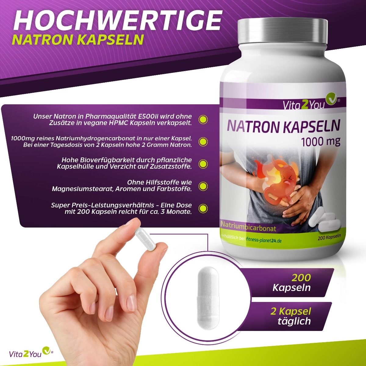 ♥ PREMIUM BAKING SODA: Our pharmaceutical-grade E500ii baking soda is encapsulated in vegan HPMC capsules without any additives. Due to its high pH value, baking soda has a beneficial effect on acidity. ♥ HIGH DOSE: 1000mg pure sodium bicarbonate in just one capsule. Therefore, a daily dose of 2 capsules provides 2g of sodium bicarbonate. ♥ VITA2YOU SODIUM BICARBONATE: Our baking soda is bottled in a certified facility under strict controls in Bavaria. ♥ SAFETY: High quality from Vita2You; every batch is tested for heavy metals in Germany. Suitable for vegetarians and vegans. ♥ HIGH PURITY: No additives and a maximum purity of at least 99% sodium bicarbonate. |