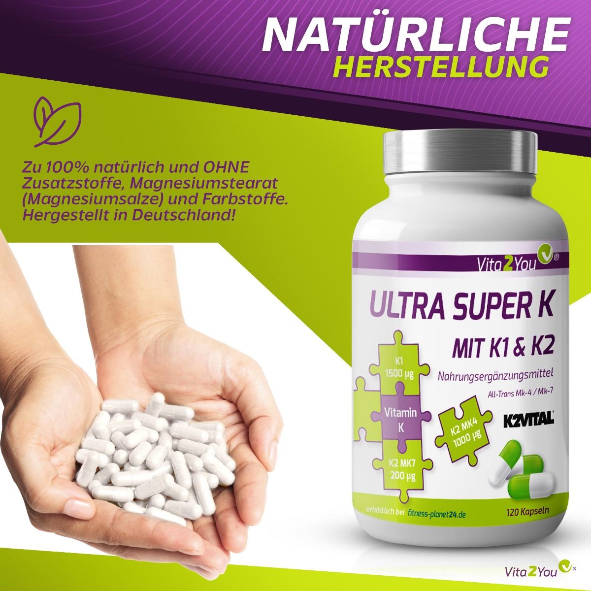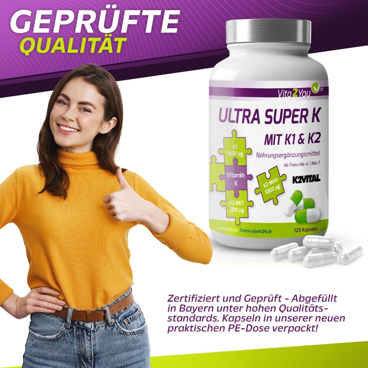 Vita2You Ultra Super K - 120 Capsules - 2700mcg Vitamin K - Vitamin K2 and K1 - High Dose