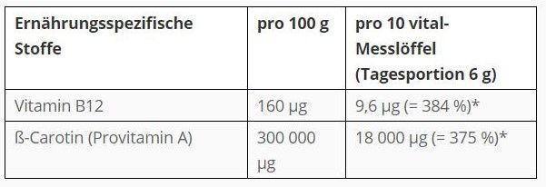 | Usage | Täglich 2 x 3 g Pulver oder 2 x 5 vital-Messlöffel (beiliegend) in Flüssigkeit einrühren, oder über Speisen gestreut verzehren. |