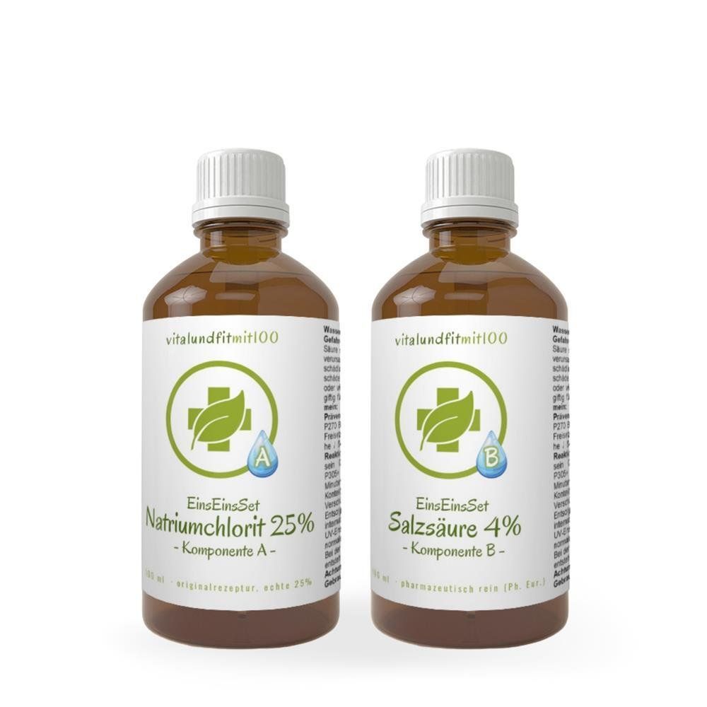 | Content | 100 ml 25 % echtes Natriumchlorit nach Originalrezept und 100 ml 4 % Salzsäure (Ph. Eur.). |