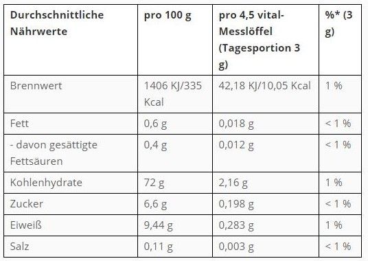 Usage Täglich 1 x 3 g Pulver oder 1 x 4,5 vital-Messlöffel (beiliegend) in Wasser, Saft oder Speisen wie Müsli, Joghurt und Obstsalat einrühren.