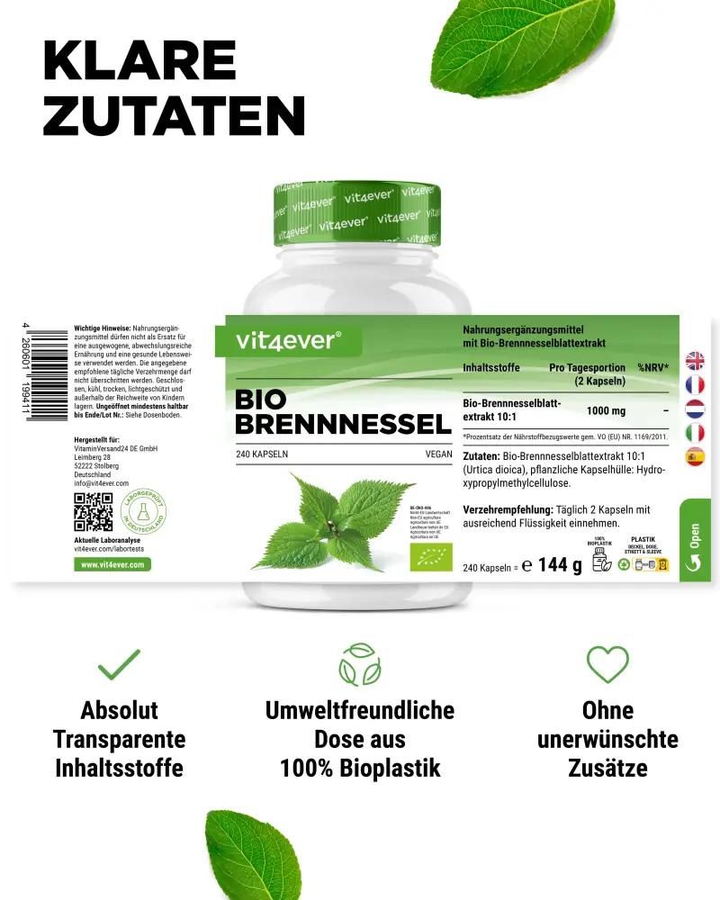 | Contents | Organic nettle leaf extract 10:1 (Urtica dioica), vegetable capsule shell: hydroxypropylmethylcellulose. |